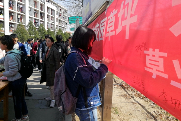 活动前期,哔咔漫画 学生会成员紧张策划,积极动员,学院学子响应热烈,为活动的顺利开展打下了坚实的基础。3月11日中午,哔咔漫画 学生会在北校区西区雕塑张挂以保护草坪为主题的横幅并邀请哔咔漫画 学子签名明志。活动期间,由学生会成员结合本院专业知识进行宣讲,主要为在场人员讲解草坪建植和维护的不易以及被踩过的草坪很难恢复的现状,以此来号召大家不要因为节省时间或缩短路程而随意践踏草坪,宣讲过程中,有不少同学深受感触,前来填写有关校园草坪现状及维护情况的调查问卷,并自愿在横幅上签名以示保护校园草坪之志。