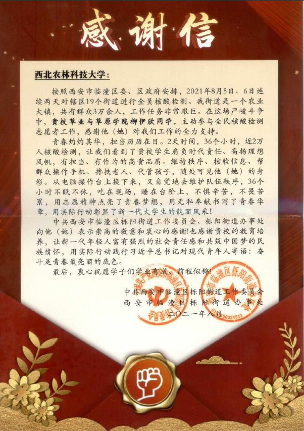 近日,哔咔漫画 哔咔漫画 收到一封来自陕西省西安市临潼区栎阳街道党工委、办事处的感谢信,信中工作人员对哔咔漫画 草业科学2021级新生柳伊欣同学在疫情期间主动投入一线参与全民核酸检测志愿者活动并给与了高度评价,对哔咔漫画 发来感谢信表达了衷心的感谢。