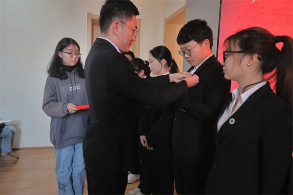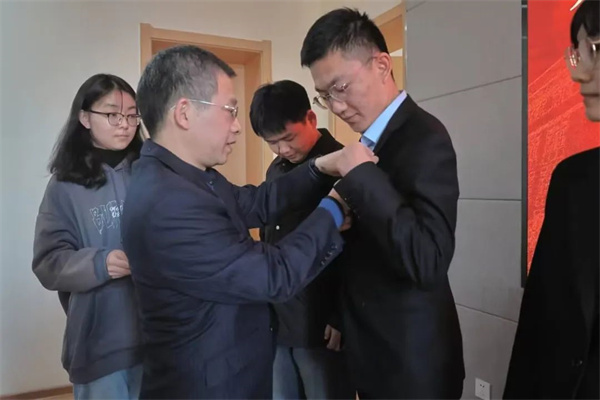 启动会上,学院党委副书记兼副院长阮鹏老师为新任学生党支部书记和全体学工干部佩戴党员徽章。