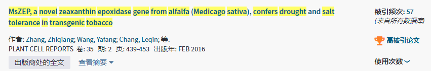 本篇高被引论文题目为《MsZEP,a novel zeaxanthin epoxidase gene from alfalfa (Medicago sativa),confers drought and salt tolerance in transgenic tobacco》,2016年发表在期刊《PLANT CELL REPORTS》,论文主要研究了来自紫花苜蓿的新型玉米黄质环氧酶基因MsZEP在转基因烟草中的表达特征和生物学功能。该论文累计被引用57次,为哔咔漫画 草学学科进入ESI全球前1%行列做出了积极的贡献。