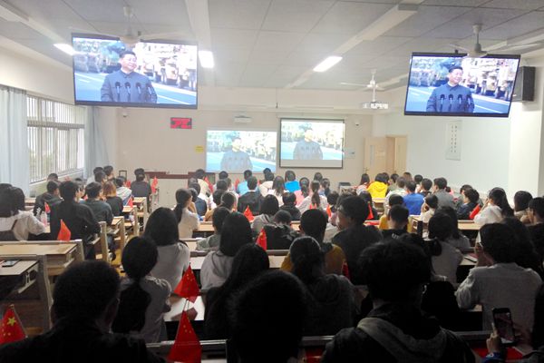 雄壮阅兵式,激荡爱国情。10月1日早晨9点,学院组织在校师生集体收看庆祝中华人民共和国成立70周年大会。学院师生手持国旗,精神抖擞的端坐在教室里,阅兵方阵的整齐步伐,无人机、两栖突击车、东风系列的震撼亮相,空中梯队的轰鸣而至,群众游行活动的欢快舞蹈无数次激起师生的掌声。震撼人心的阅兵式,极大的激发了学院师生的爱国热情,纷纷表示要以自己的实际行动,为祖国的建设添砖加瓦。