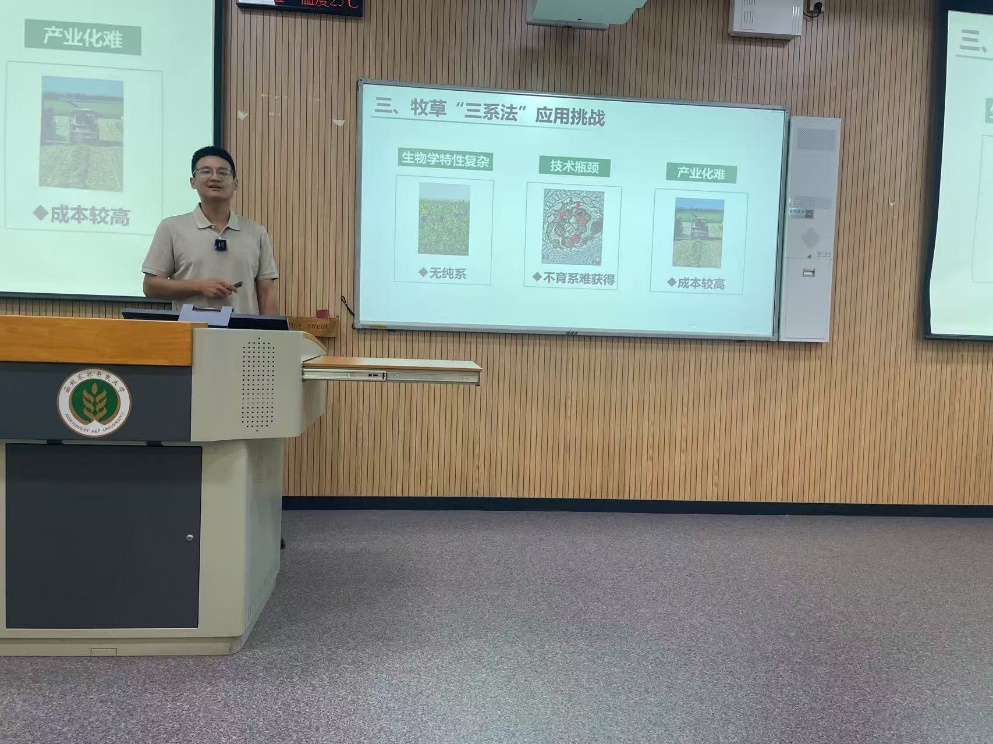 以德立身,牢记强农兴农使命。安杰副教授始终坚持以习近平新时代中国特色社会主义思想铸魂育人,积极参加师德师风专题培训、高校青年教师国情研修,把“四有”好老师标准贯穿教学科研全过程,以实际行动践行“为党育人、为国育才”初心使命。思政铸魂,润物无声育英才。本次参赛课程以“三系法”杂种优势利用为主线,有机融入“杂交水稻之父”袁隆平“丰功伟绩,济世惠民”的家国情怀,引导学生深刻认识农业科技自立自强对保障国家粮食安全的战略意义;通过剖析牧草“三系法”应用瓶颈,激励学生勇担破解种业“卡脖子”难题的时代重任,培养学生的生态文明意识与知农爱农情怀,实现价值塑造、知识传授与能力培养的深度融合。课堂之上,安杰副教授巧用基因型图谱、制种过程动画等信息化手段,把抽象的遗传机理转化为生动的“三农”故事,让学生在掌握前沿科学的同时,筑牢强农兴农、科技报国的理想信念。未来,安杰副教授将继续深耕牧草育种教学科研一线,以更加昂扬的斗志、更加扎实的学识,为培养堪当民族复兴重任的卓越农林人才贡献智慧与力量。