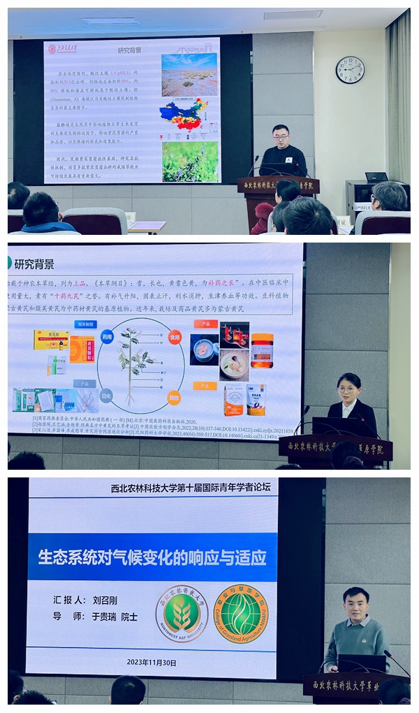 上海交通大学博士后苏连泰、中国农业大学在读博士生陈怡、中科院地理资源所在读博士生刘召刚分别以“紫花苜蓿MsMYB转录因子的抗逆功能研究” “黄芪种质创制与道地产区形成机制研究” “生态系统对气候变化的响应与适应” 为题,围绕MsMYB206提高紫花苜蓿耐盐及暗环境适应能力机制研究、黄芪种质资源圃构建和黄芪的演化路线、基于中国草地样带-草原生态系统碳通量组分对气候变化的分歧响应等方进行报告和交流,介绍了最新研究进展。与会师生就报告内容、领域研究热点与三位学者进步一交流和探讨,就青年学者所关心的人才引进政策等问题进行了解答。